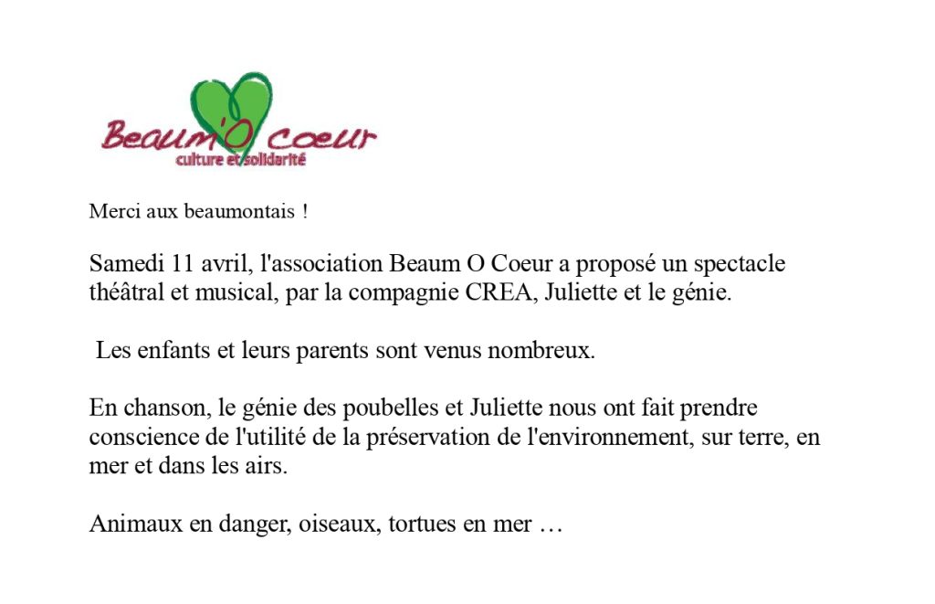 Samedi 11 avril à 15h30 à Beaumont sur Lèze, l’association Beaum’O Coeur, propose un spectacle pour les enfants, un conte théâtral et musical alliant musique, chants, marionnettes, contes ;